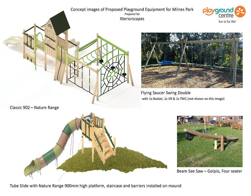 We earlier spoke about the playground plans that have been approved by the City Council and now, we can give you a sneak peak on what the play equipment will look like. Encompassing the 'natural look' and nestled in semi mature oak trees the playground at Milns Park blends into the serenity quite nicely.