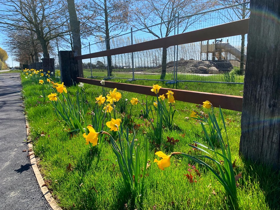 Photos taken on a STUNNING Spring Saturday at Milns Park. With existing trees, bulbs and shrubbery this well established garden entrance simply looks beautiful. Check out the playground coming along in the background not long now till we see wee kiddies using it to its full potential including custom made scooter track and half basketball court.